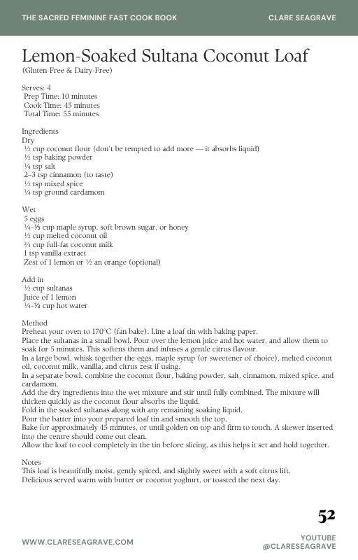 This Lemon-Soaked Sultana Coconut Loaf is a beautiful balance of nourishment and comfort. Naturally gluten-free and made with coconut flour, it’s rich in healthy fats and protein to support stable energy and blood sugar. The sultanas are gently softened in warm lemon juice, adding a subtle citrus brightness that lifts the warm spices of cinnamon, cardamom, and mixed spice. The result is a moist, lightly sweet loaf that feels both grounding and indulgent — perfect for a slow morning, an afternoon pause, or a nourishing treat that loves your body back.